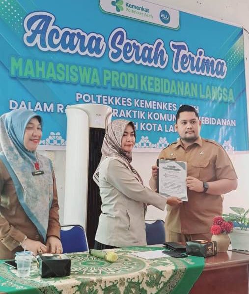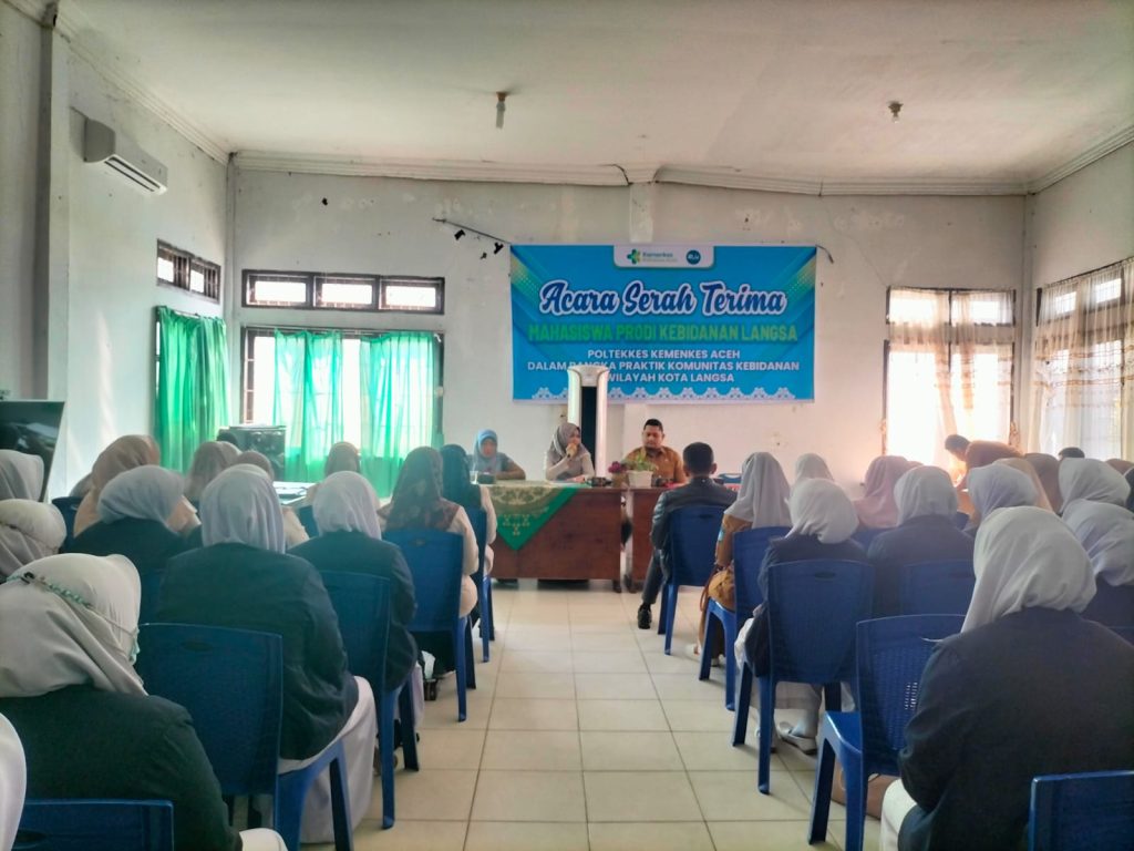 Serah terima mahasiswa praktik komunitas kebidanan diwilayah Kota Langsa tepatnya pada wilayah Kecamatan Langsa Baro yang dilakukan oleh Ka. Prodi D-III Kebidanan Langsa Ibu Cut Mutiah, S.ST, M.Keb beserta Camat Langsa Baro yaitu Bapak Zaldi Sofyan, S.STP, M.A.P bertempat di Kantor Camat Langsa Baro diikuti oleh dosen pembimbing, mahasiswa, bidan desa dan unsur terkait (Bdn.Lgs)
