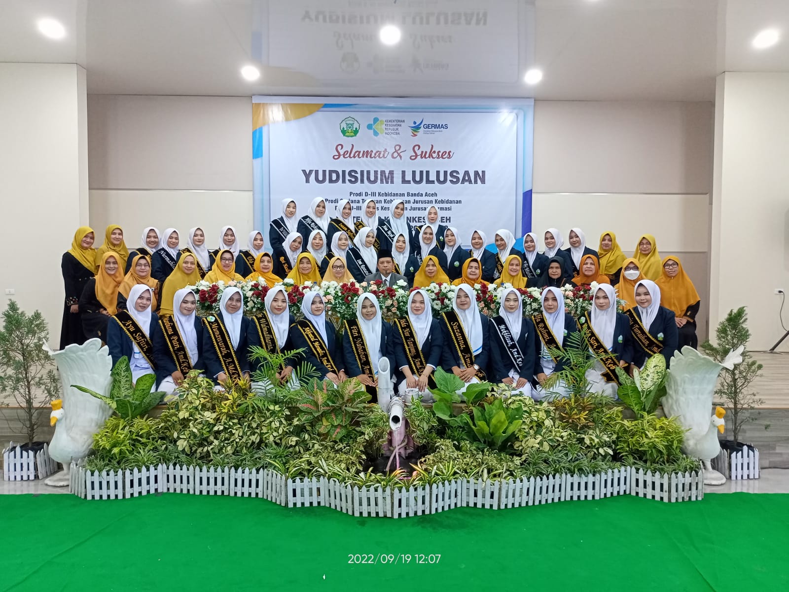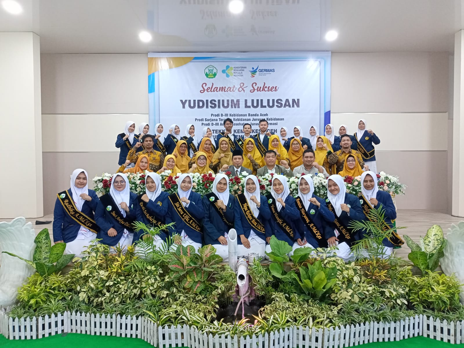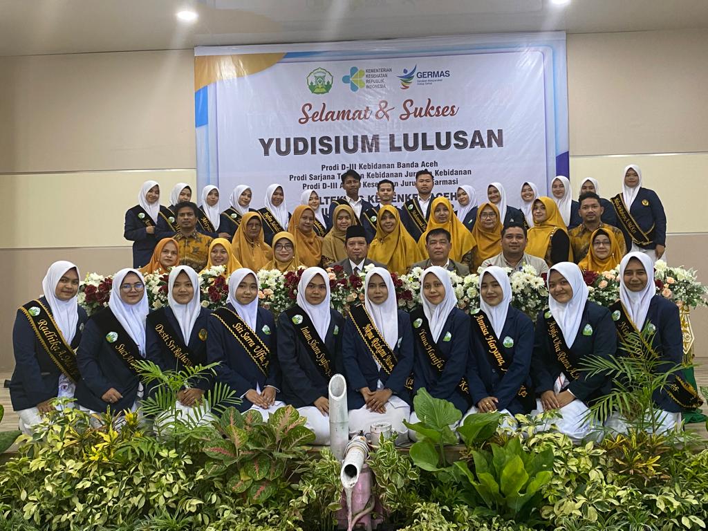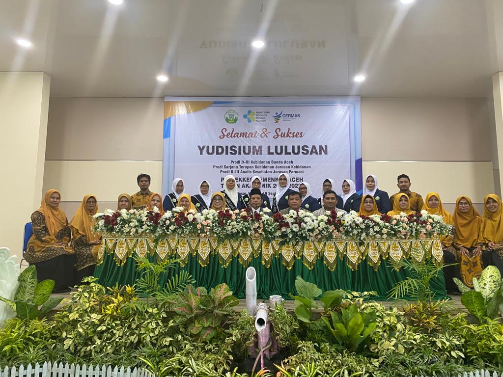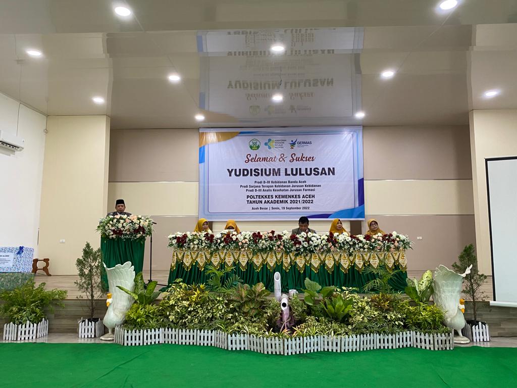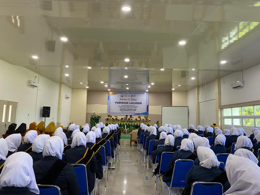Aceh Besar, 19 September 2022 bertempat di aula Jurusan Kebidanna Poltekkes Kemenkes Aceh telah berlangsung Yudisium Mahasiswa Prodi D-III Kebidanan Banda Aceh, Prodi Sarjanan Terapan Kebidanan Banda Aceh dan Prodi D-III Analis Kesehatan Jurusan Farmasi Poltekkes kemenkes Aceh tahun ajaran 2021/2022. Yudisium yang disegrakan pada tahun ini merupakan gabugan dari Jurusan Farmasi Prodi D-III  Analis Kesehatan. Total mahasiswa  Yudisium yang diselengarakan yaitu 105 mahasiswa.  Prodi D-III Kebidanan  Banda Aceh berjumlah 35 Mahasiswa, Prodi Sarjanan Terapan Kebidanan Banda Aceh berjumlah 35 dan Prodi D-III Analis Kesehatan Jurusan Farmasi berjumlah 35. Yudisium ini dihadiri langsung oleh direktur Poltekkes Kemenkes Aceh T.Iskandar Faisal, S.KP.,M.Kes.